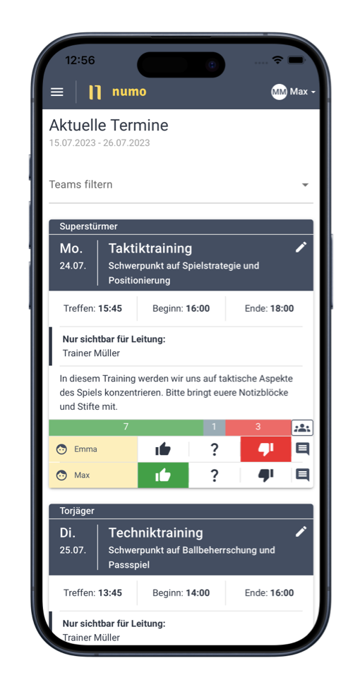 Reibungslose und zeitnahe Kommunikation zwischen Trainer:innen, Spieler:innen und Eltern. Bleibe stets auf dem Laufenden.
